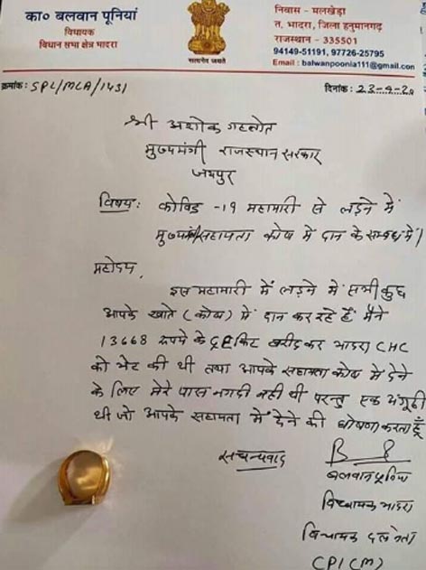विधायक ने अपने पास नकद न होने पर अपनी एकलौती सोने की अंगूठी दान कर दी , इसके साथ ही कोरेना से लड़ाई के अभियान में उन्होंने लगातार काम भी किया। राजस्थान के हनुमानगढ़ जिले के भादरा के विधायक बलवान पुनिया जो भारतीय कम्युनिष्ट पार्टी मार्क्सवादी के सदस्य हैं।