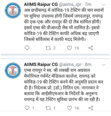 अब छत्तीसगढ़ में कोविड-19 टेस्टिंग की चार स्थानों पर सुविधा उपलब्ध होगी जिसमें जगदलपुर, रायगढ़ की एक-एक और रायपुर की दो लैब शामिल होंगी। इसमें एम्स की वीआरडी लैब भी शामिल है। इससे कोविड-19 की टेस्टिंग काफी अधिक बढ़ जाएगी जिससे सर्विलांस में काफी मदद मिलेगी।