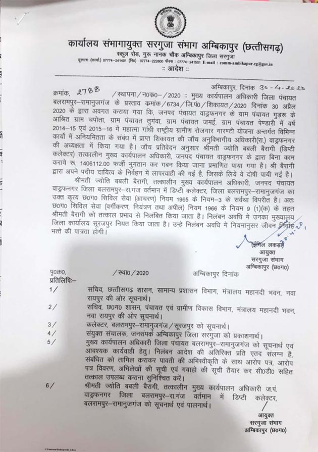 इससे पूर्व सरगुजा संभाग आयुक्त ने इस मामले की जांच के संबंध में जानकारी के लिए जिला पंचायत सीईओ को पत्र लिखकर इस मामले में कथित रूप से शामिल डिप्टी कलेक्टर ज्योति बबली बैरागी समेत तत्कालीन मुख्य कार्यपालन अधिकारी एसके साहू, तत्कालीन कार्यक्रम अधिकारी अश्वनी तिवारी के मामले में जिला कलेक्टर को अवगत कराये जाने के आदेश भी दिए हैं. जाँच में ज्योति बबली बैरागी को 1406112 रूपये फर्जी भुगतान करना पाया गया जिस पर आज बैरागी को ससपेंड कर दिया गया है.