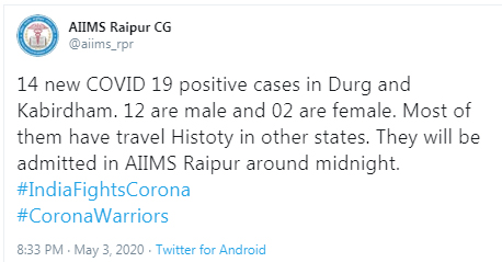 रायपुर:- कोरोना वायरस को लेकर छत्तीसगढ़ से एक बड़ी खबर सामने आई है। खबर है कि छत्तीसगढ़ में 14 नए कोरोना संक्रमितों की पुष्टि हुई है। जानकारी के मुताबिक 14 नए कोरोना मरीज दुर्ग और कवर्धा इलाके से हैं, जिसमे से 12 पुरुष और 2 महिला शामिल है। इसके साथ ही प्रदेश में कुल कोरोना संक्रमितों की संख्या बढ़कर 57 हो गई है। वहीं, एक्टीव मरीजों की संख्या 21 हो गई है। बता दें कि प्रदेश में अब तक 36 कोरोना संक्रमित ठीक होकर अपने घर लौट चुके हैं। खबर विस्तार से अपडेट की जा रही है. तथा खबरों की सुखियो में रहने और दहशत फ़ैलाने में हम विश्वास नहीं करते।