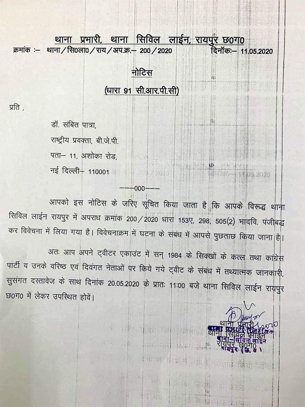 सिविल लाइन में दर्ज प्रकरण के मुताबिक 10 मई 2020 को संबित पात्रा के ट्विटर हैंडल से पोस्ट कर नेहरू और राजीव गांधी को भ्रष्ट कहने पर कांग्रेसियों ने शिकायत की है.