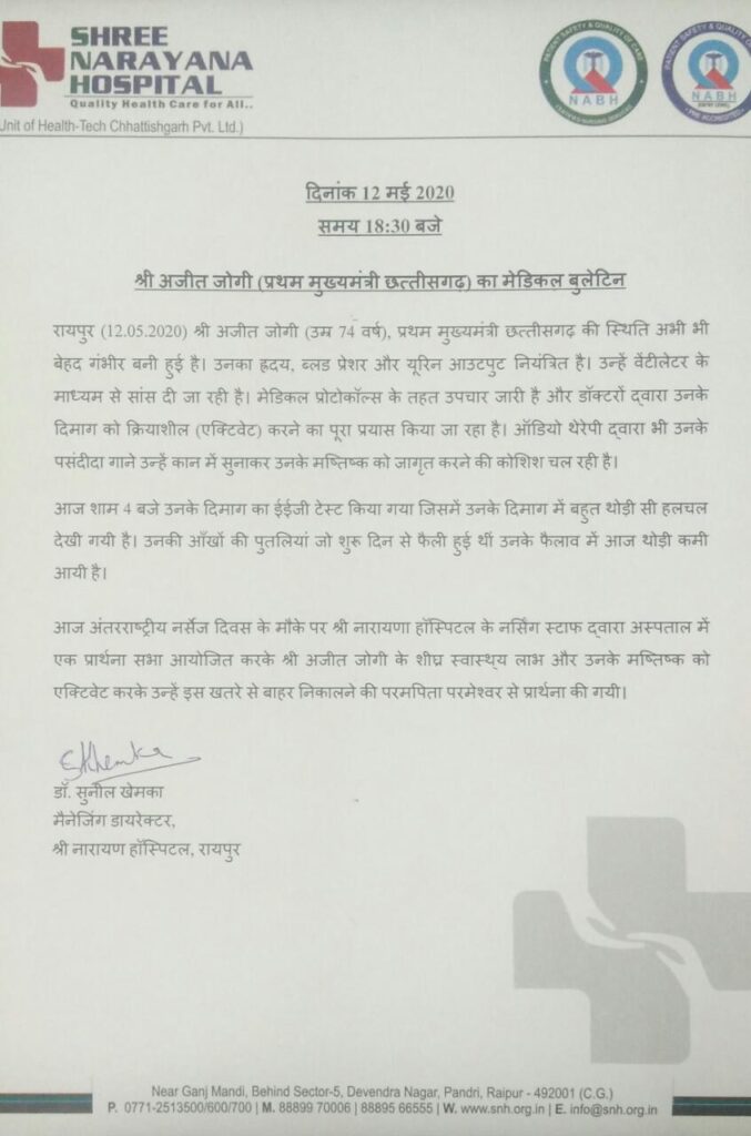 रायपुर। कोरोना संकट से जुड़ी एक बेहद ही अहम खबर आ रही है। अजीत जोगी की तबीयत में बेहद ही मामूली सुधार देखा गया है। जारी मेडिकल बुलेटिन के मुताबिक शाम 4 बजे दिमाग की ECG टेस्ट में मस्तिष्क में बहुत थोड़ी सी हलचल देखी गयी, वहीं उनकी आंखों की पुतलियां जो शुरू दिन से फैली हुई थी, उनके फैलाव में आज थोड़ी कमी आयी है।
