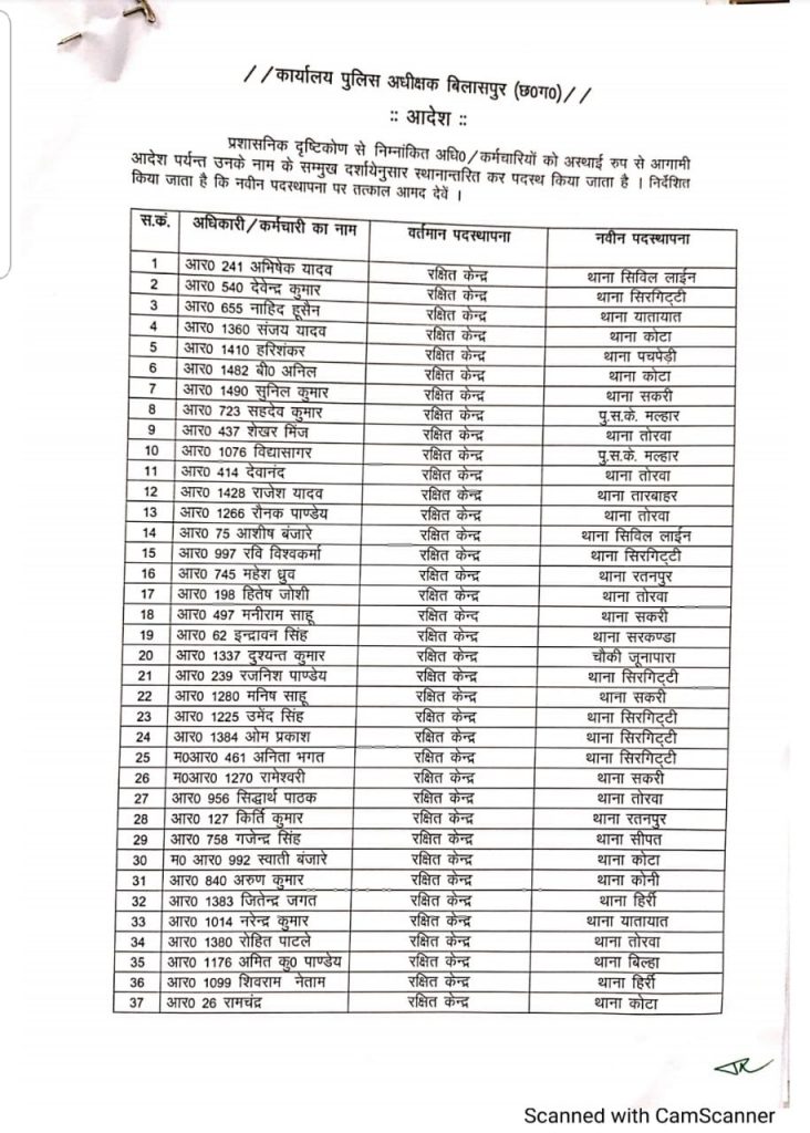 बिलासपुर। जिले में बड़े पैमाने पर आरक्षक और प्रधान आरक्षकों का तबादला आदेश जारी किया गया है. यह आदेश एसपी प्रशांत अग्रवाल ने जारी किया है. तबादला आदेश में खास बात यह रही कि 20 आरक्षक ऐसे हैं, जिन्हें पहली बार थानों में पदस्थापना मिली हैं. और लगभग 25 ऐसे रसूखदार आरक्षकों का भी तबादला किया गया हैं जो पिछले 5 सालों से एक ही थाने में पदस्थ थे.