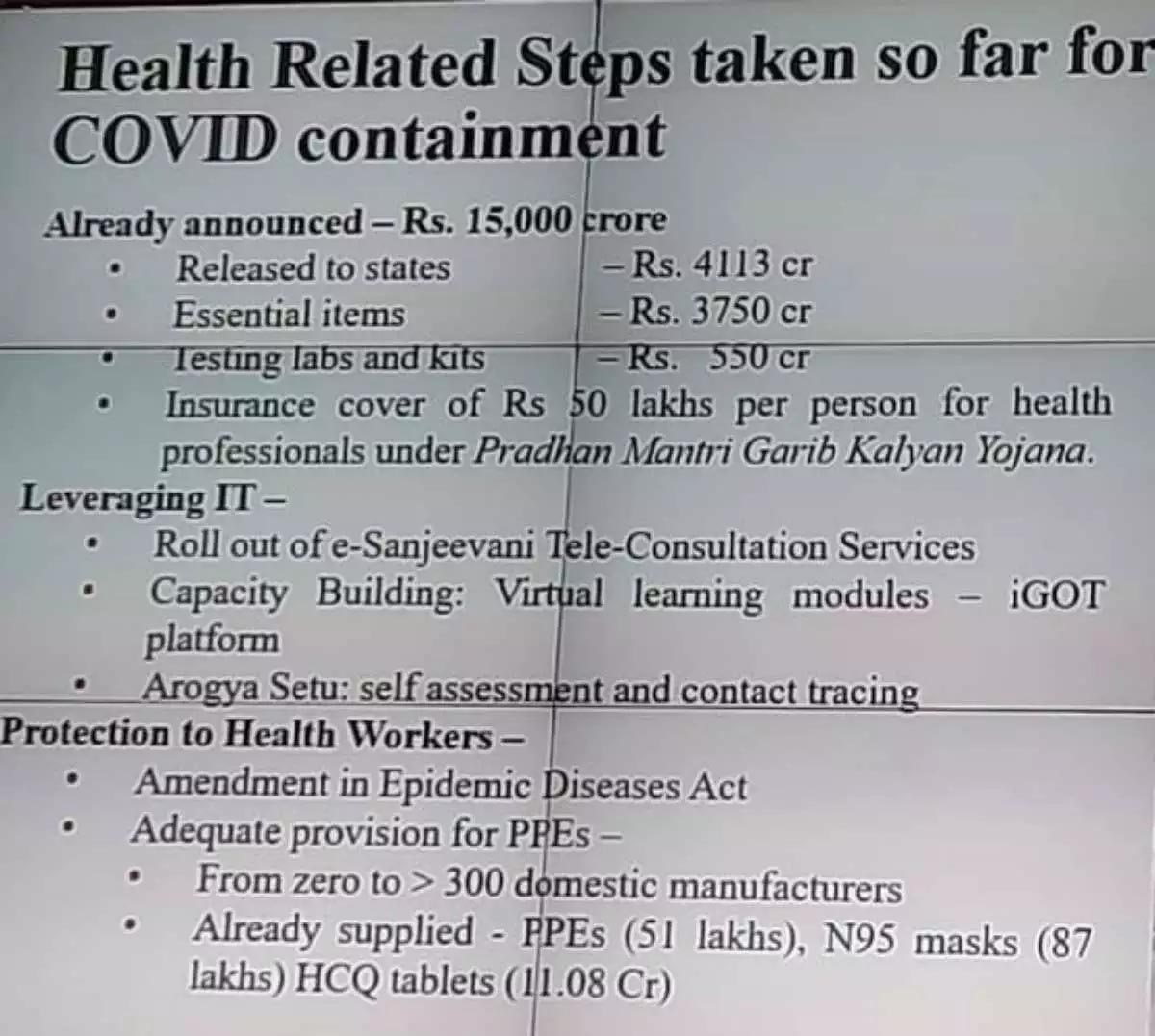 कोरोना के संक्रमण को रोकने के लिए सरकार ने क्या किया, इसकी जानकारी भी प्रेस कॉन्फ्रेंस में दी गई। वित्त मंत्री ने बताया कि 15,000 करोड़ रुपये में से 4,113 करोड़ रुपये राज्यों को दिए गए। 3,750 करोड़ से जरूरी उपकरण खरीदे गए। हर हेल्थ प्रोफेशनल के लिए 50 लाख रुपये के इंश्योरेंस का प्रावधान किया गया। एपिडेमिक ऐक्ट में बदलाव कर हेल्थ वर्कर्स तक मदद पहुंचाई गई। आज देश में 300 से ज्यादा मैनुफैक्चरर्स PPE किट्स बना रहे हैं। हमने 51 लाख PPEs, 87 लाख N95 मास्क सप्लाई किए हैं।