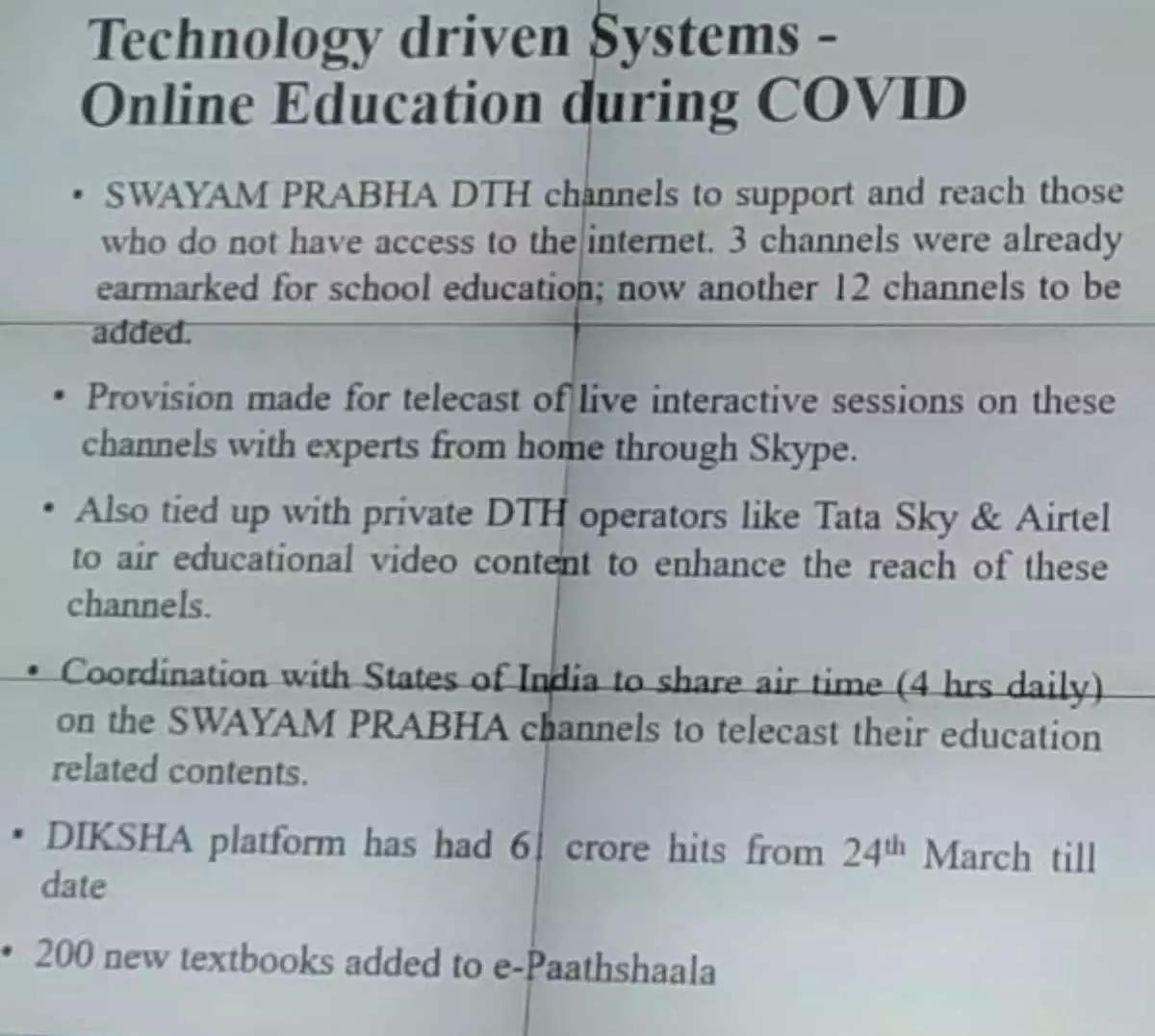 ‘पीएम ई-विद्या प्रोग्राम’ की जल्द शुरुआत होगी। एजुकेशन के लिए ‘दीक्षा’ नाम का नया प्लैटफॉर्म। हर क्लास के लिए टीवी चैनल शुरू होगा। रेडियो, कम्युनिटी रेडियो और पॉडकास्ट्स का यूज बढ़ेगा। दिव्यांग बच्चों के लिए नया कंटेंट डेवलप होगा। टॉप 100 यूनिवर्सिटीज को ऑटोमेटिकली ऑनलाइन कोर्सेज शुरू करने की परमिशन मिलेगी।