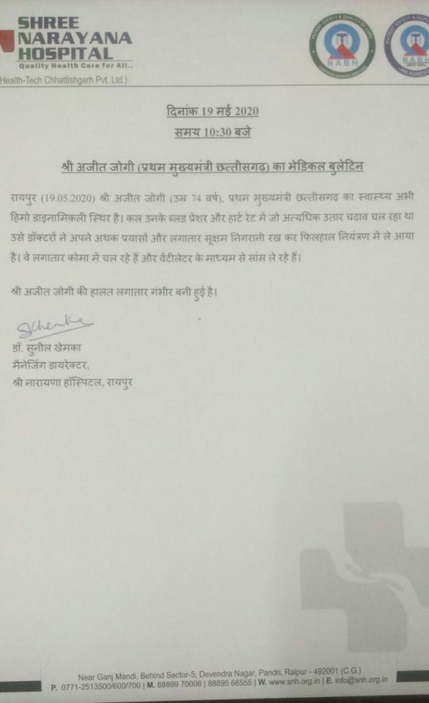 रायपुर। श्री नारायणा हॉस्पिटल ने पूर्व मुख्यमंत्री अजीत जोगी की सेहत को लेकर मेडिकल बुलेटिन जारी किया है. मेडिकल बुलेटिन के अनुसार अजीत जोगी का स्वास्थ्य अभी हिमो डाइनामिकाली स्थिर है. कल उनके ब्लड प्रेशर और हार्ट रेट में जो अत्यधिक उतार चढ़ाव चल रहा था उसे डॉक्टरों ने अपने अथक प्रयासों और लगातार सूक्षम निगरानी रख कर फिलहाल नियंत्रण में ले आया है. वे लगातार कोमा में चल रहे है और वेंटिलेटर के माध्यम से सांस ले रहे है. अभी भी अजीत जोगी की हालत लगातार गंभीर बनी हुई है.