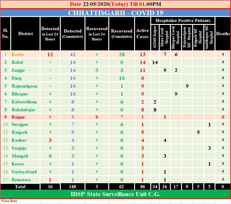 कोरोना वायरस को लेकर छत्तीसगढ़ से राहत की खबर सामने आई है. मिली जानकारी के मुताबिक सिम्स बिलासपुर से जांजगीर जिले के कोरोना से पीड़ित 03 मरीज़ आज स्वस्थ होने के उपरांत डिस्चार्ज किए गए। इस तरह राज्य में कुल 86 सक्रिय मरीज़ हैं। आज पाए गए पॉजिटिव प्रकरणों की भर्ती की प्रकिया जारी है।