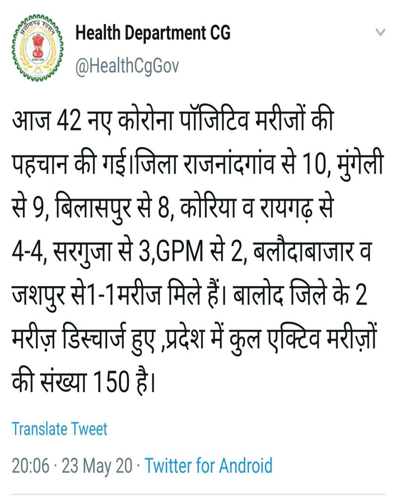 रायपुर। छत्तीसगढ़ में शनिवार को अब तक कुल 42 नए कोरोना पॉजिटिव मरीजों की पहचान की गई है। इनमें जिला राजनांदगांव से 10, मुंगेली से 9, बिलासपुर से 8, कोरिया व रायगढ़ से 4-4, सरगुजा से 3,गौरेला पेंड्रा मरवाही से 2, बलौदाबाजार व जशपुर से 1-1मरीज मिले हैं। साथ ही बालोद जिले के 2 मरीज डिस्चार्ज हुए हैं। इस तरह से प्रदेश में कुल एक्टिव मरीजों की संख्या 150 हो गई है। इसकी पुष्टि स्वास्थ्य विभाग ने अपने ट्वीटर हैंडल पर की है।