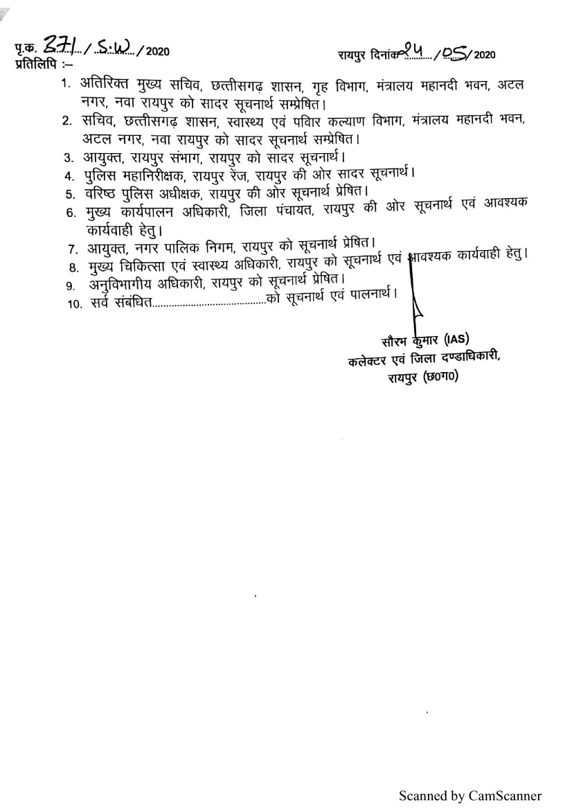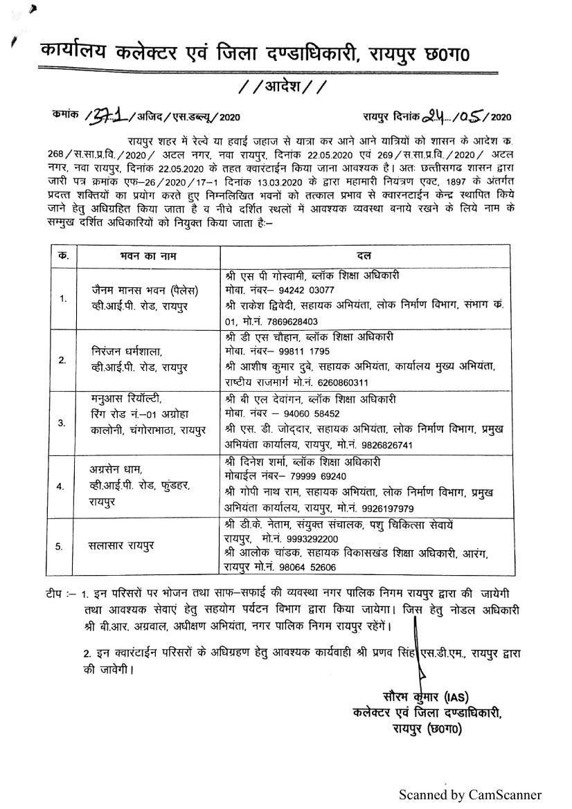 रायपुर। राजधानी में रेल या हवाई मार्ग से आने वाले यात्रियों को क्वारंटाइन करने के लिए कलेक्टर सौरभ कुमार ने आदेश जारी किया है। जारी आदेश के अनुसार जैनम मानस भवन वीआईपी रोड, निरंजन धर्मशाला वीआईपी रोड, मनुआस रियाल्टी चंगोराभाठा, अग्रसेन धाम वीआईपी रोड और सालासर रायपुर को अधिग्रहित किया गया है। इसके साथ ही यहां व्यवस्था बनाए रखने के लिए अधिकारियों की नियुक्ति भी की गई है।