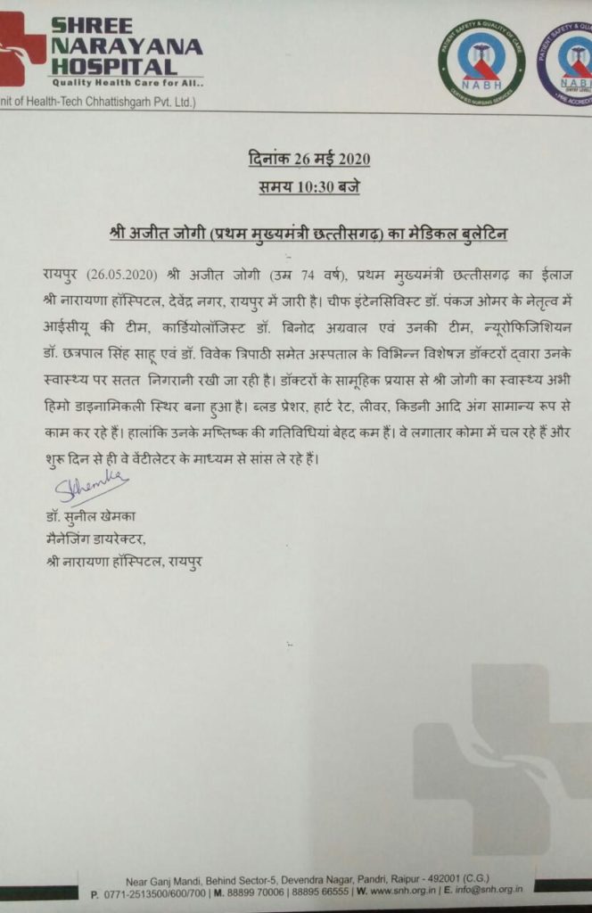 डॉक्टरों के सामूहिक पप्रयास से अजीत जोगी का स्वास्थ्य अभी हिमो डाई नामिकली स्थिर बना हुआ है. ब्लड प्रेशर , हार्ट रेट, लीवर , किडनी आदि अंग सामान्य रूप से काम कर रहे है. हालांकि उनके मष्तिष्क की गतिविधियां बेहद कम है. वे लगातार कोमा में चल रहे है और शुरू दिन से ही वे वेंटिलेटर के माध्यम से साँस ले रहे है.