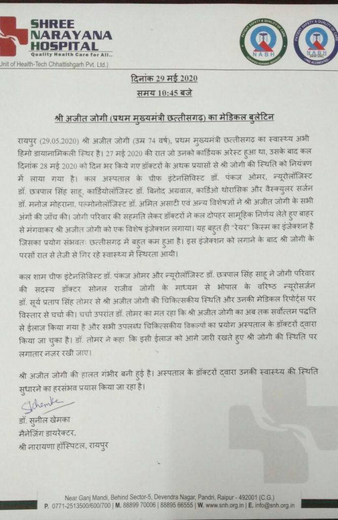 रायपुर। पूर्व मुख्यमंत्री अजीत जोगी की हालत आज भी हिमो डायानामिकली स्थिर है। 27 मई की रात उनको कार्डियक अरेस्ट हुआ था, उसके बाद कल दिनांक 18 मई को दिन भर किए गए डॉक्टरों के अथक प्रयासों से श्री जोगी की स्थिति को नियंत्रण में लाया गया है। कल अस्पताल के डा. पंकज ओमर, न्यूरोलॉजिस्ट डा. छत्रपाल सिंह साहू, कार्डियोलाजिस्ट डा. विनोद अग्रवाल, कार्डियो थोरासिक और वैस्क्युलर सर्जनन डा मनोज मोहराना, पल्मोनोलाजिस्ट डा. अमित असाटी एवं अन्य विशेषज्ञों ने श्री जोगी के सभी अंगों की जांच की। जोगी परिवार की सहमति लेकर डॉक्टरों ने कल दोपहर सामूहिक निर्णय लेते हुए बाहर से मंगवाकर श्री जोगी को एक विशेष इंजेक्शन लगाया। यह बहुत ही रेयर किस्म का इंजेक्शन है जिसका प्रयोग संभवत: छत्तीसगढ़ में बहुत कम हुआ है।
