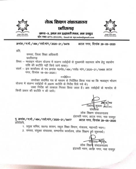 रायपुर। राज्य के सभी शासकीय स्कूलों में कार्यरत मध्यान भोजन रसोईया संघ के स्वैच्छिक वेतन कटौती के आग्रह पर लोक शिक्षण संचनालय ने आदेश जारी करते हुए उनके वेतन से 200 रूपए कटौती करने के आदेश को तत्काल प्रभाव से रद्द कर दिया है। इस आशय का आदेश भी जारी हो गया है।