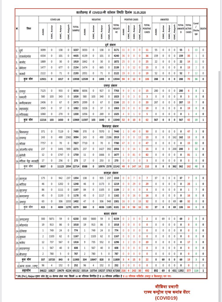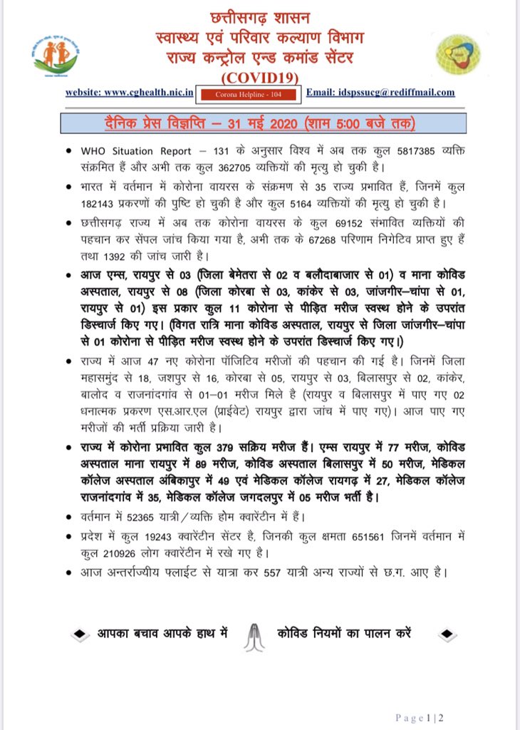 रायपुर। छत्तीसगढ़ में आज कुल 47 नए कोरोना पाॅजिटिव मरीजों की पहचान की गई। वहीं 12 मरीज़ स्वस्थ होने के उपरांत डिस्चार्ज किए गए।कुल एक्टिव मरीज़ों की संख्या 379 है। जिसमे महासमुंद से 18 , जशपुर से 16, कोरबा से 5, रायपुर से 3, बिलासपुर से 2, कांकेर , बालोद व राजनांदगांव से 1-1 मरीजों की पुष्टि हुई है.