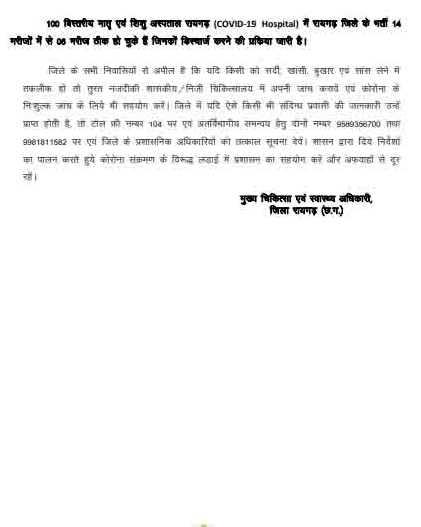 रायगढ़। आज जिले के कोरोना मरीजों के विषय में राहत भरी और बड़ी खुशखबरी मिल रही कि रायगढ़ कोविड-19 MCH मेडिकल अस्पताल में भर्ती 6 कोरोना मरीज अब पूरी तरह से स्वस्थ होकर डिस्चार्ज हो रहे हैं। डिस्चार्ज करने से पूर्व इनका पुनः कोरोना टेस्ट किया गया था जिसमें नेगेटिव रिपोर्ट आने के बाद उन्हें उनके घर वापस भेजा जा रहा है। बता दें कि कोरोना संक्रमण से निजात पाने वाले ये 6 मरीज प्रवासी मजदूर हैं। कल तक रायगढ़ में कुल 20 कोरोना मरीज एडमिट थे. अब 6 लोगों के आज जाने के बाद 14 कोरोना मरीज अस्पताल में रहेंगे।