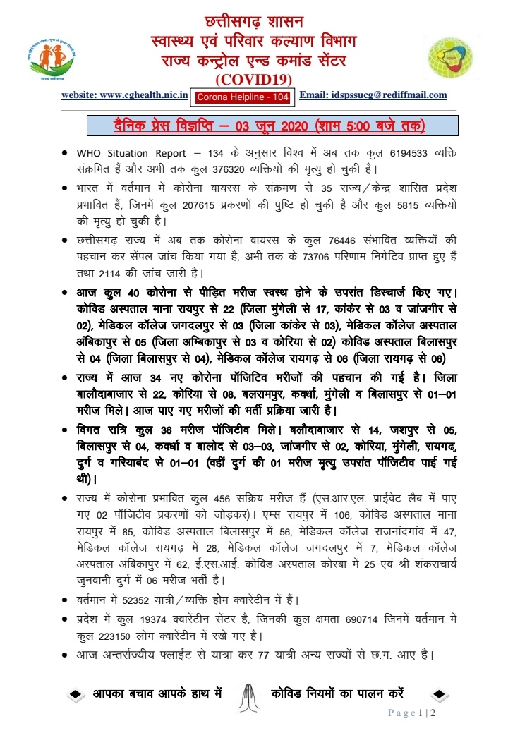 रायपुर। कोरोना वायरस को लेकर स्वास्थ्य विभाग ने मेडिकल बुलेटिन जारी किया है. मेडिकल बुलेटिन के अनुसार आज प्रदेश में कुल 34 नए कोरोना पाॅजिटिव मरीजों की पहचान की गई। वहीं 40 मरीज़ स्वस्थ होने के उपरांत डिस्चार्ज किए गए। कुल एक्टिव मरीज़ों की संख्या 456 है।