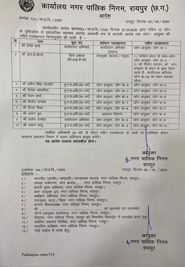 रायपुर। नगर पालिक निगम रायपुर के जोनों में कमिश्नरों की नवीन पदस्थापना की गई है। हेमंत शर्मा कार्यपालन अभियंता उद्यान को जोन-1 कमिश्नर बनाया गया है। जारी आदेश के अनुसार प्रशासनिक दृष्टिकोण से आयुक्त नगर पालिक निगम रायपुर सौरभ कुमार ने यह फेरबदल किया है।