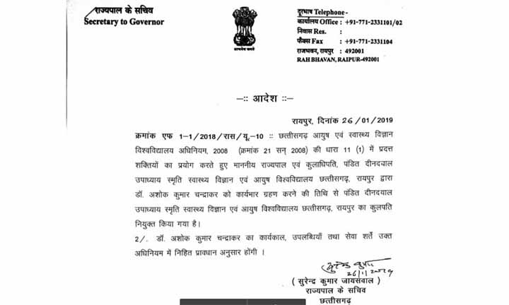 यह नियुक्ति छत्तीसगढ़ आयुष एवं स्वास्थ्य विज्ञान विश्वविद्यालय अधिनियम 2008 में प्रदत्त शक्तियों का प्रयोग करते हुए राज्यपाल एवं कुलाधिपति ने की है.