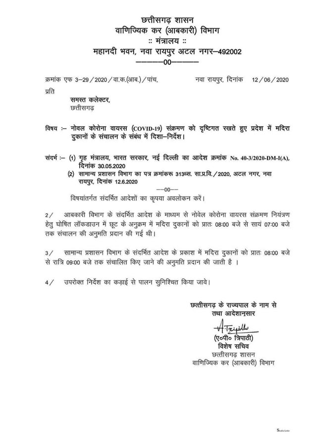 रायपुर:- छत्तीसगढ़ सरकार से 12 जून को जारी आदेश में प्रदेश में शराब दुकानों का समय सामान्य दिवसों की तुलना में 2 घंटे बढ़ा दिया गया है, कोरेना महामारी के पहले सामान्य तौर पर ये दुकाने सुबह 10 से रात्रि 9 बजे तक खुला करती थी , अब अनलॉक 1.00 में इनका समय सुबह 8 से रात्रि 9 बजे तक का दिया गया है। जाहिर है सरकार शराब से प्राप्त आय को किसी भी कीमत में कम नही होने देना चाहती जबकि आम जनता और विरोधी दल लगातार उसे चुनावपूर्व के शराब बंदी के वायदे की याद दिला कर इस नीति के औचित्य पर विचार करने को कह रहे हैं।
