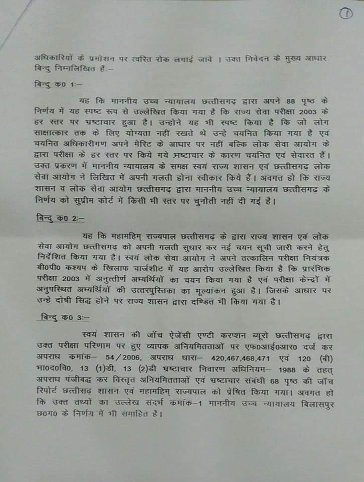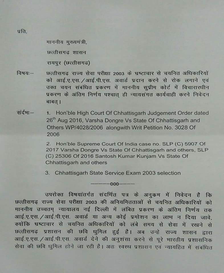 पत्र में हाईकोर्ट में याचिकाकर्ता रही वर्षा ने लिखा है कि भ्रष्टाचार से चयनित अधिकारियों को लंबे समय से सेवा में रखने से छत्तीसगढ़ प्रशासन की छवि धूमिल हुई है, ऐसे में अगर उन अफसरों को IAS-IPS अवार्ड हुआ तो पूरे भारतीय प्रशासनिक व पुलिस सेवा की छवि धूमिल हो जायेगी। अपने तीन पेज के पत्र में वर्षा डोंगरे ने बिंदुवार पूरे चयन प्रक्रिया और मामले में कूट रचना का जिक्र किया है।