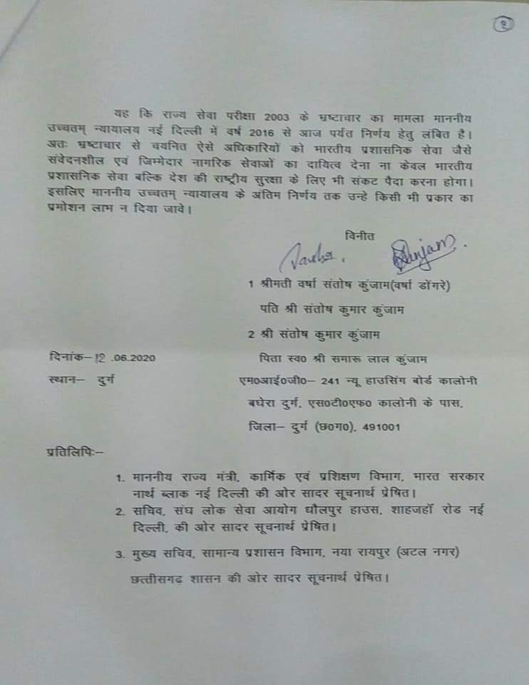 वर्षा डोंगरे और संतोष कुंजाम ने पत्र में लिखा है कि 2003 में फर्जीवाड़ा कर चयन होने वाले अभ्यर्थियों का पूरा प्रकरण में सुप्रीम कोर्ट में साल 2016 से ही विचाराधीन हैं, लिहाजा मामले में फैसला नहीं आने तक 2003 बैच के अफसरों को भारतीय पुलिस और प्रशासनिक सेवा के लिए अनुशंसित करना करना सही नहीं होगा।