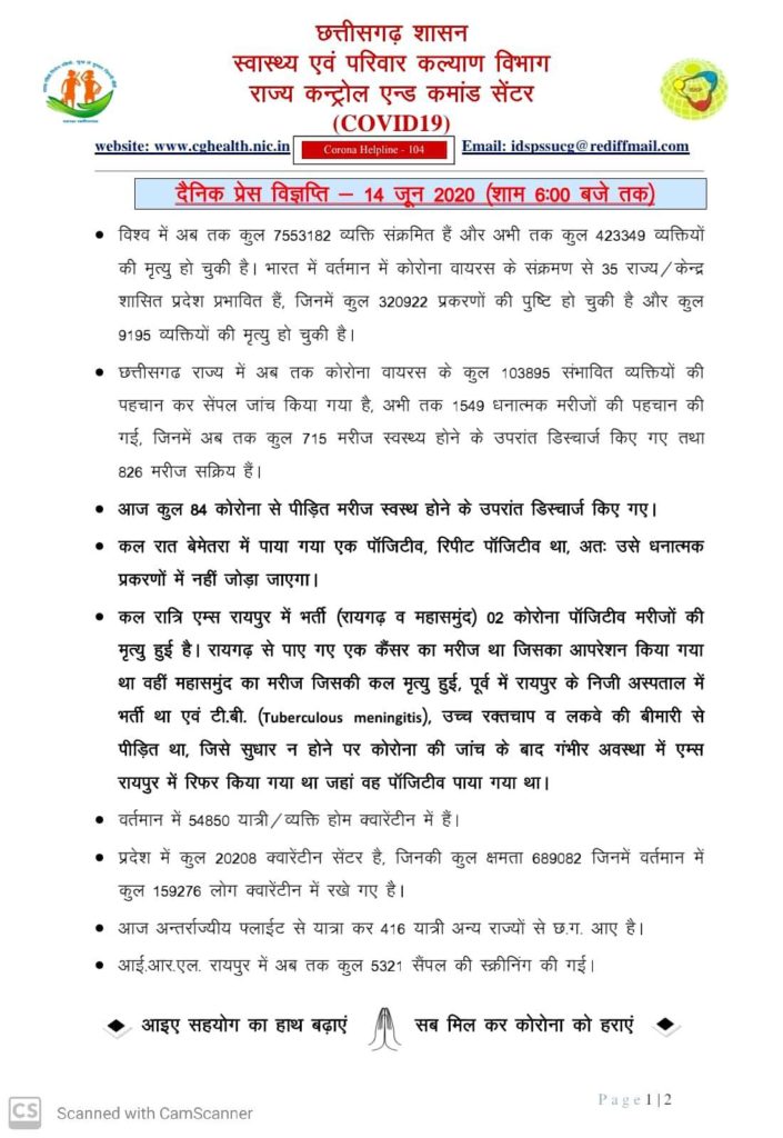 इनमें से रायगढ़ के मरीज को केंसर था जिसका कि हाल ही में ऑपरेशन हुआ था वहीं दूसरा मृतक महासमुंद से है जिसे टीबी सहित उच्च रक्तचाप तथा लकवे की बिमारी थी। दोनों को कोरोना जांच के बाद गंभीर अवस्था में एम्स में भर्ती किया गया था। इस तरह रविवार देर शाम तक प्रदेश में कुल कोरोना संक्रमितों की संख्या 1549 हो गई है जिनमें से 715 मरीज स्वस्थ्य होकर घर लौट चुके है और 826 सक्रीय मरीज है। वहीं 6 लोगों की मौत हो चुकी है जिनमें से दो की कोरोना से तथा चार लोगों की अन्य बिमारियों के चलते मौत हुई है।