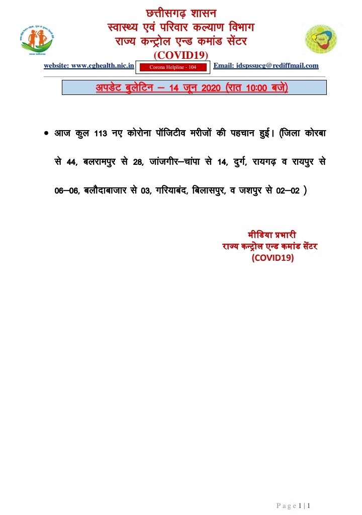 छत्तीसगढ़/रायपुर। आज कुल 113 कोरोना पॉजिटिव मरीज़ों की पहचान हुई। जिसमे कोरबा जिले से 44, बलरामपुर से 28, जांजगीर-चाम्पा से 14, दुर्ग, रायगढ़ व रायपुर से 6-6 , बलौदाबाजार से 3, गरियाबंद , बिलासपुर व जशपुर से 2-2 मरीज शामिल है. 84 कोरोना से पीड़ित मरीज़ स्वस्थ होने के उपरांत डिस्चार्ज किए गए।