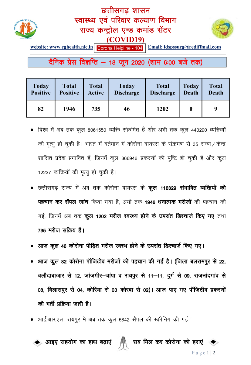 रायपुर। छत्तीसगढ़ में कोरोना संक्रमितों का आंकड़ा फिर बढ़ा है। गुरुवार को प्रदेश में 82 नए मरीज मिले हैं। वहीं 46 मरीज स्वस्थ होने के बाद डिस्चार्ज किए गए हैं। स्वास्थ्य विभाग ने इसकी पुष्टि की है। बताया गया कि बलरामपुर से 22, बलौदाबाजार से 12, जांजगीर चांपा और रायपुर से 11-11, दुर्ग से 9, राजनांदगांव से 8, बिलासपुर से 4, कोरिया से 3 और कोरबा से 2 मरीज मिले हैं। प्रदेश में कुल पॉजिटिव मरीजों की संख्या 1946 है जबकि 735 एक्टिव केस अब भी हैं। जबकि अब तक कुल 1202 पॉजिटिव स्वस्थ होने के बाद डिस्चार्ज कर दिए गए हैं।