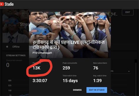रायपुर,(इंडिया न्यूज़ रूम):- छत्तीसगढ़ शिक्षा विभाग द्वारा सूर्य ग्रहण के अवसर पर स्कूली छात्रों को सूर्य ग्रहण के कारण बताने उनमें वैज्ञानिक दृष्टिकोण उत्पन्न करने तथा उनकी विभिन्न शंकाओं का समाधान करने और टेलीस्कोप द्वारा सूर्य ग्रहण दिखाने के उद्देश्य से सूर्य ग्रहण के दिन प्रातः 10:00 बजे से दोपहर के 2:00 बजे तक ऑनलाइन कार्यक्रम आयोजित किया गया ।