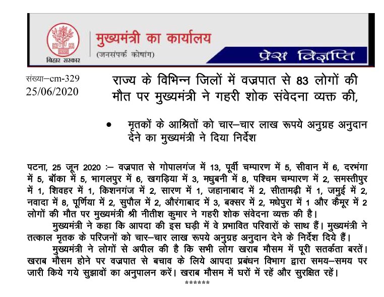 बिहार के मुख्यमंत्री ने इतनी बड़ी तादाद में जानमाल की क्षति के बाद शोक जताया है और सभी मृतकों के घरलवालों के लिए 4-4 लाखरुपये मुआवजे का ऐलान किया है। सीएम नीतीश ने लोगों से अपील की है कि खराब मौसम में घर से बाहर न निकलें और राज्य के आपदा प्रबंधन विभाग की तरफ से दिए जा रहे निर्देशों का पालन करते रहें।