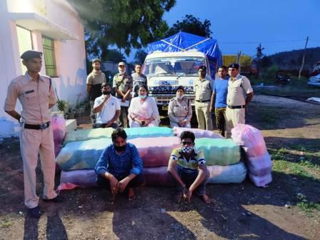 आरोपी सिघोड़ा थाना क्षेत्र- सुमोद अहिरवार पिता शिब्बू अहिरवार उम्र्र 24 साल निवासी खाजेरा उद्देत हरिजन मोहल्ला वार्ड नं. 7 थाना सनौद जिला सागर मध्य प्रदेश। विष्णु प्रसाद पटेल पिता बलराम पटेल उम्र 31 साल निवासी पडरिया थाना सनोद जिला सागर मध्यप्रदेश इनके पास से 420 कि.ग्रा. गांजी कीमती 42,00,000 रूपये। स्वराज माजदा 1 नग क्रमांक सीजी07सीए 6918 कीमती 10.00.000 रूपये। मोबाईल 3 नग