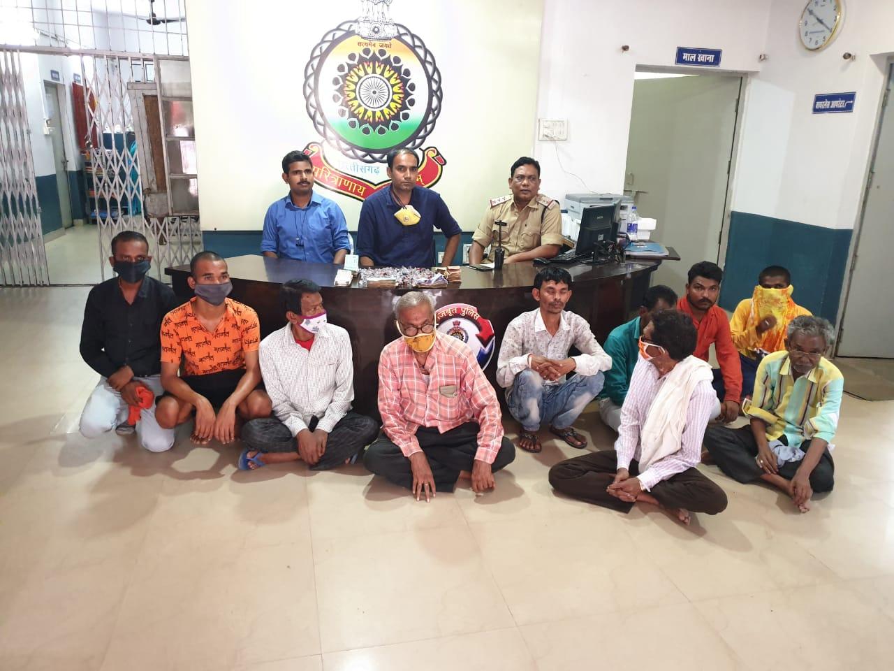 पकड़े गये आरोपियों में आपापुरा दुर्ग से मेनका सपहा उम्र 32 साल, चुकुन सार्वा उम्र 28 साल, विमला सपहा उम्र 42 साल, शेखर सहाय उम्र 51 साल, बरातू उर्फ मनोहर अली 62 साल, चंडी मंदिर दुर्ग से सुरेन्द्र यादव उम्र 32 साल, संदीप यादव उम्र 20 साल, गया नगर दुर्ग से डोमेन्द्र मिश्रा उम्र 73 साल, रूपचंद बनवासी उम्र 60 साल, बजरंग नगर दुर्ग से बंशी लाल सिन्हा उम्र 52 साल, राम निर्मलकर उम्र 29 साल, विक्की उर्फ देवेन्द्र उम्र 28 साल, केवल साहू उम्र 30 साल शामिल हैं।