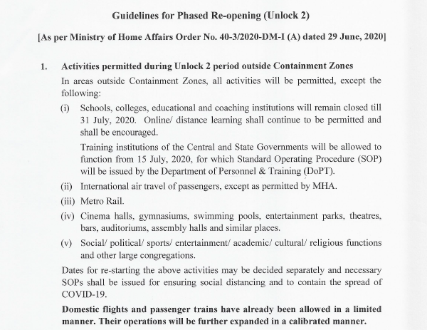 चरणबद्ध तरीके से गतिविधयों को शुरू करने काम अनलॉक-1 में ही कर दिया गया था. अनलॉक-2 में भी इसे आगे बढ़ाया जाएगा. अनलॉक-2 की गाइडलाइंस अलग-अलग क्षेत्रों के लोगों से परामर्श लेने के बाद जारी की गई हैं. इसमें राज्य, संघ शासित प्रदेश और केंद्र मंत्रालय व उसके विभाग भी शामिल हैं.