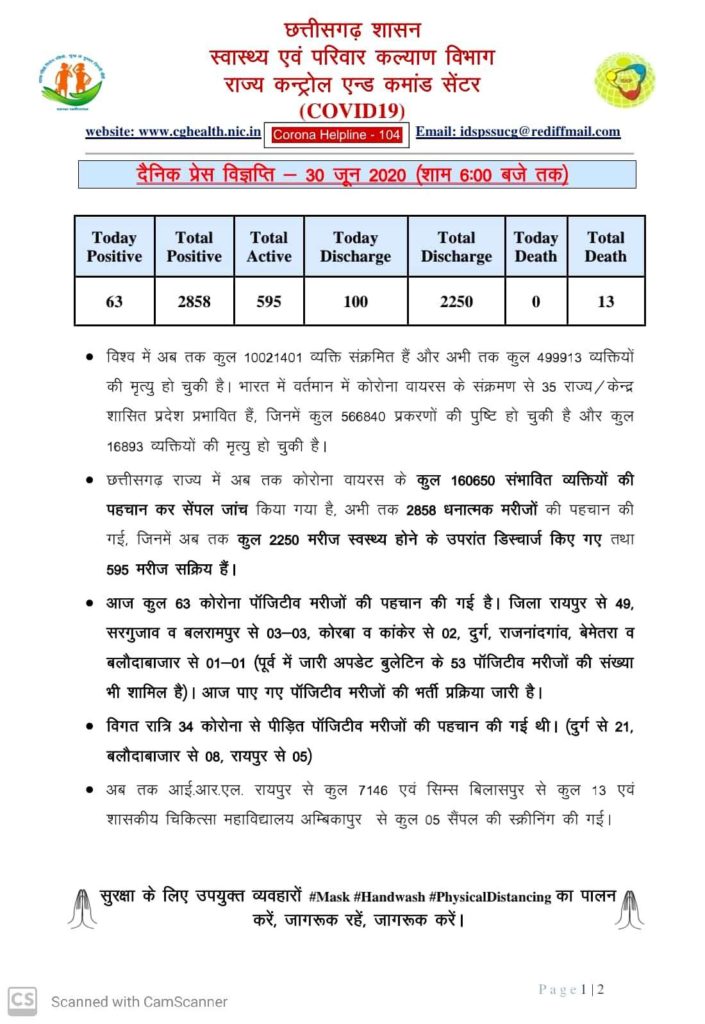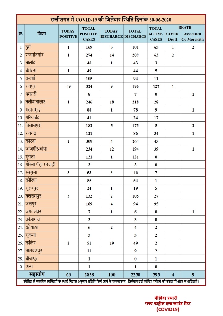 रायपुर। छत्तीसगढ़ में जिस तेजी से कोरोना संक्रमितों के मरीज बढ़े है अब उसी तेजी से संक्रमित मरीज स्वस्थ भी होने लगे है। मंगलवार को 100 संक्रमित मरीज फिर डिस्चार्ज हुए है, जिसके बाद राज्य में डिस्चार्ज हुए मरीजों की संख्या कुल 2250 हो गई है। हालांकि आज 63 नये संक्रमित मरीजों की पहचान भी गई है, जिससे अब राज्य में सक्रिय मरीजों की संख्या 595 है। स्वास्थ्य विभाग द्वारा आज शाम को जारी किए गए बुलेटिन के अनुसार राज्य में आज 63 नये मरीज मिले है, ये मरीज क्रमश: जिला रायपुर से 49, सरगुजा व बलरामपुर से 03-03, कोरबा व कांकेर से 02-02, दुर्ग, राजनांदगांव, बेमेतरा व बलौदाबाजार से 01-01 मरीज मिले है। इस तरह राज्य में कोरोना संक्रमितों का आकड़ा 2858 पहुंच गया है। हालांकि इनमें से अब तक 2250 मरीज स्वस्थ हो चुके है, जबकि मृतको की संख्या 13 है।