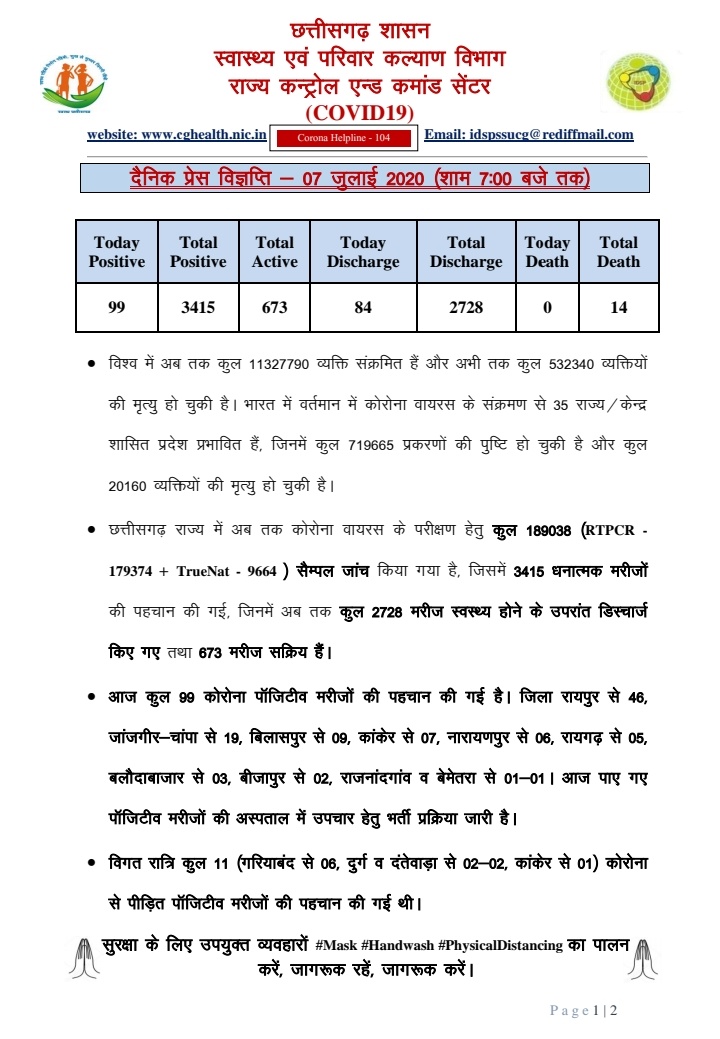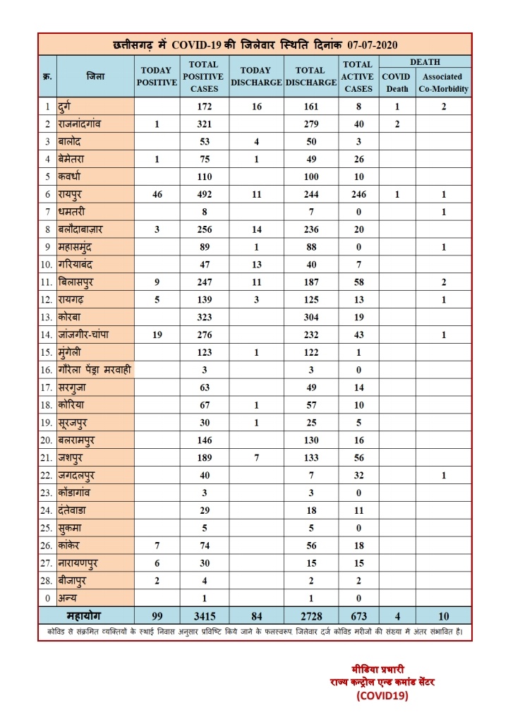 रायपुर। छत्तीसगढ़ में मंगलवार को 99 नये कोरोना संक्रमित मरीजों की पहचान की गई है, वहीं 84 भर्ती मरीजों को डिस्चार्ज भी किया गया है। जिसके बाद राज्य में अभी सक्रिय मरीजों की संख्या 673 है। आज सर्वाधिक 46 मरीज रायपुर जिले में मिले है। स्वास्थ्य विभाग द्वारा आज शाम को जारी बुलेटिन के अनुसार राज्य में आज 99 नये संक्रमित मिले मरीजों में क्रमश: जिला रायपुर में 46, जांजगीर-चांपा से 19, बिलासपुर से 09, कांकेर से 07, नारायणपुर से 06, रायगढ़ से 05, बलौदाबाजार से 03, बीजापुर से 02 तथा राजनांदगांव बेमेतरा से 01-01 मरीज मिला है। आज पाये गये पॉजीटिव मरीजों की अस्पताल में उपचार हेतु भर्ती प्रक्रिया जारी है। वहीं आज 84 भर्ती मरीजों को स्वस्थ होने के बाद डिस्चार्ज किया गया है। इसके बाद राज्य में अभी सक्रिय मरीजों की संख्या 673 है।