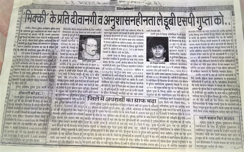 पिछले दिनों निलंबित और ढेर सारी धाराओं में दर्ज प्रकरणों में वांछित, वरिष्ठ आई पी एस अधिकारी मुकेश गुप्ता संयुक्त मध्यप्रदेश के ज़माने में जब उज्जेन पुलिस अधीक्षक थे और लगातार शिकायतों के कारण उनका तबादला मध्यप्रदेश के पुलिस महानिदेशक सुभाषचंद्र त्रिपाठी के लगातार शिकायतों के बाद तत्कालीन मुख्यमंत्री दिग्विजय सिंग को तत्काल करवाना पड़ा . DG से नाराजगी को उनके इंजिनियर पुत्र से आफिसर्स मेस में दुर्व्यवहार करके निकालना , षड़यंत्र रचना और साथी अधीनस्थों से मारपीट की शिकायतों का जैसे अम्बार सा लगा हुआ था , 23 अगस्त वर्ष 2000 को दैनिक अग्निबाण (उज्जेन ), इन्दोर में प्रकाशित खबर की कतरन देखिये – होनहार बिरवान के होत- चीकने पात . कहावत का लब्बो लुआब समझ में आ जायेगा .