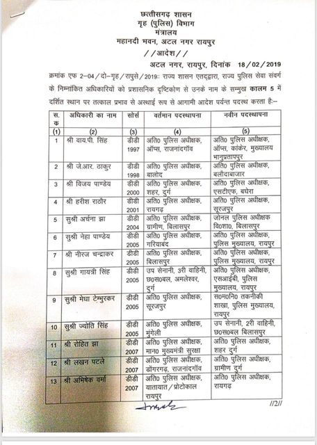 जबकि चंद्रभान सिंह बंसोड़ सुकमा के प्रभारी सीएमएचओ, विरेंद्र कुमार ठाकुर को कोंडांगांव, एस.के. कंवर को सुकमा का नया सीएमएचओ, एस.के. तिवारी को जिला चिकित्सा अधिकारी गरियाबंद बनाया गया है.सुजय मुखर्जी को कबीरधाम का सिविल सर्जन बनाया गया है.