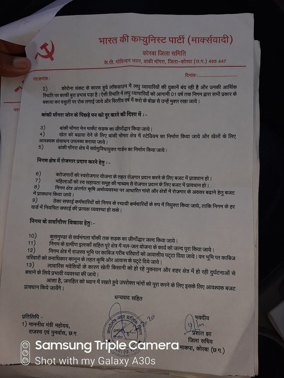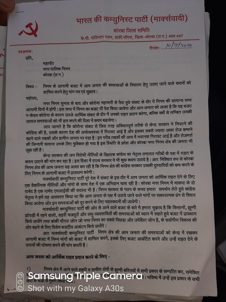 मार्क्सवादी कम्युनिस्ट पार्टी पूरे देश में संकट के इस दौर में आम जनता को आर्थिक राहत देने के लिए एक वैकल्पिक नीतियों और मांगों के साथ देशव्यापी अभियान-आंदोलन चला रही है। कोरबा नगर निगम में माकपा के दो पार्षद है। एक पार्षद एमआईसी की सदस्य भी है। निगम सरकार के गठन के समय हमारा समर्थन लेते हुए कांग्रेस नेतृत्व ने हमें यह आश्वस्त किया था कि आम जनता के पक्ष में उठायी जाने वाली मांगों पर सकारात्मक ढंग से विचार किया जाएगा और इन समस्याओं को दूर करने के लिए पहलकदमी की जाएगी।