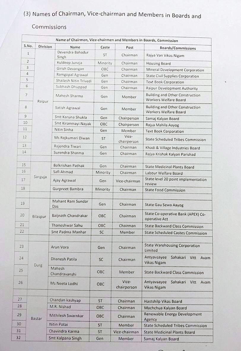 रायपुर:- छत्तीसगढ़ सरकार द्वारा आयोग, निगम, मंडलों के अध्यक्ष, उपाध्यक्ष और सदस्यों की सूची जारी। 32 नेताओं को मिली जगह। रायपुर संभाग से 14,सरगुजा संभाग से 4,बिलासपुर संभाग से 4,दुर्ग संभाग से 4,बस्तर संभाग से 6 नेताओं को मिली जगह।