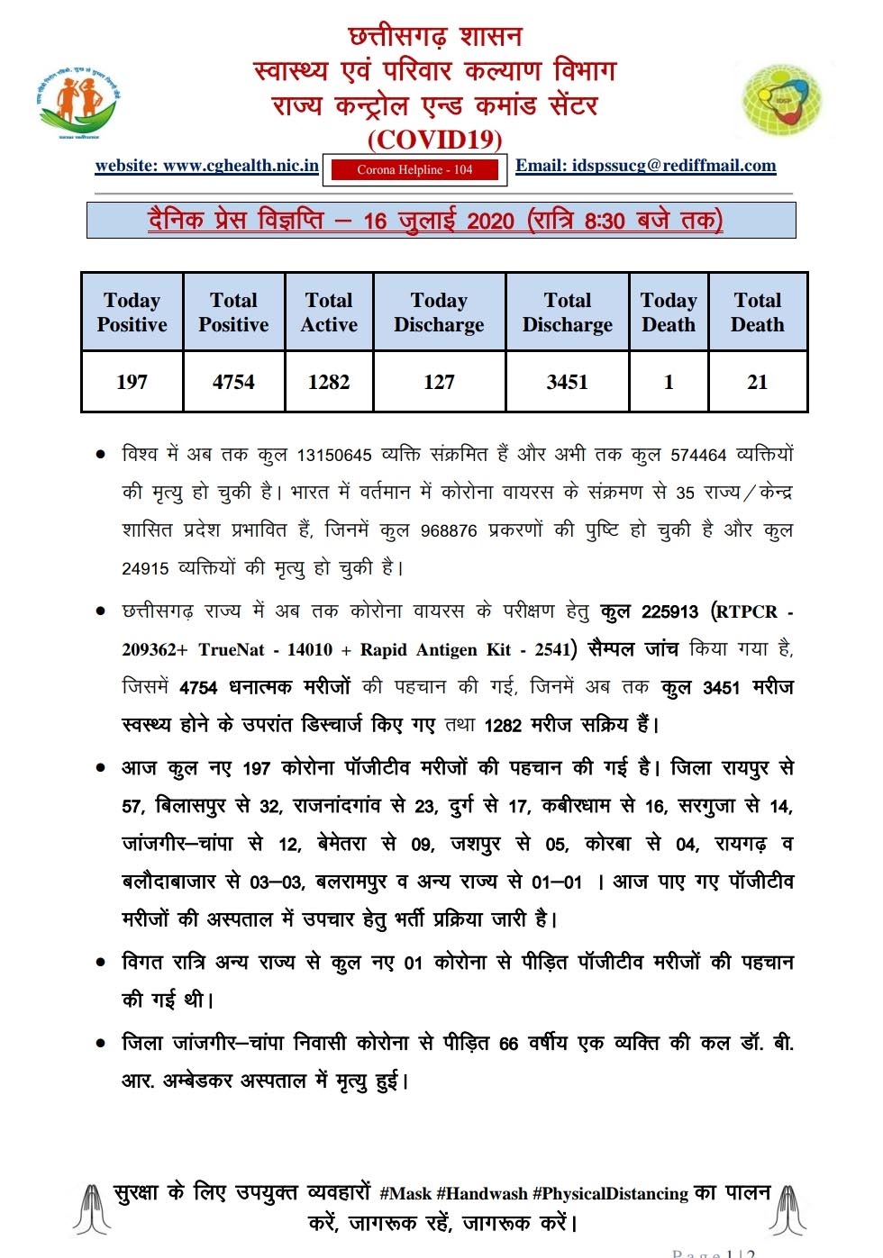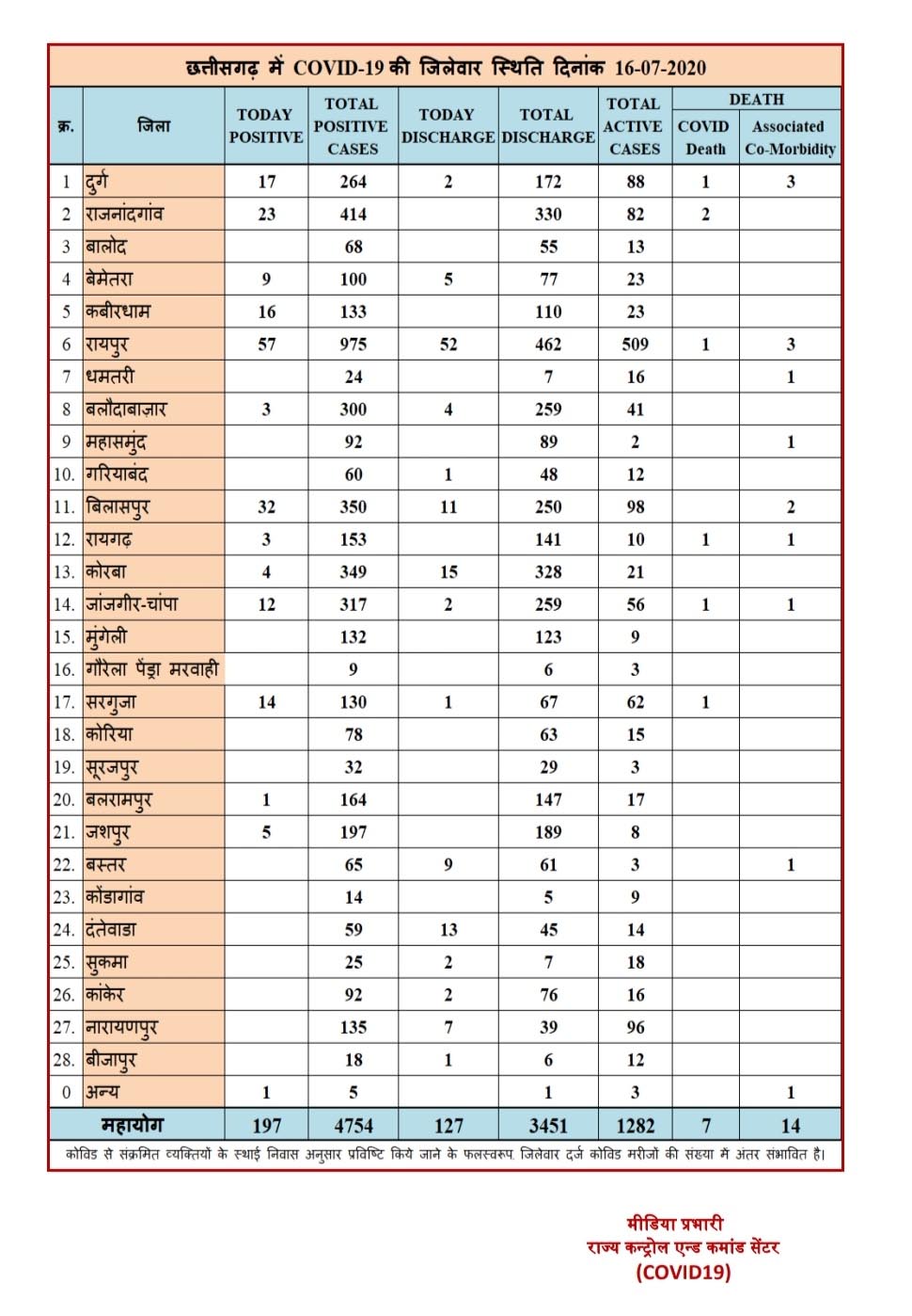 रायपुर। कोरोना वायरस को लेकर छत्तीसगढ़ स्वास्थ्य विभाग ने मेडिकल बुलेटिन जारी किया है. मेडिकल बुलेटिन के अनुसार आज प्रदेश में अब तक कुल 197 नए कोरोना पाज़िटिव मरीज़ों की पहचान हुई। जिसमे रायपुर से 57, बिलासपुर से 32, राजनांदगांव से 23, दुर्ग से 17, कबीरधाम से 16, सरगुजा से 14, जांजगीर- 12, बेमेतरा से 9, जशपुर से 5, कोरबा से 4,रायगढ़-बलौदाबाजार से 3-3 मरीज शामिल है. बुलेटिन के अनुसार आज एक और मरीज की मौत हो गई है.अब प्रदेश में 21 लोगों की कोरोना से जान जा चुकी है. राज्य में एक्टिव मरीज़ों की संख्या 1282 है।