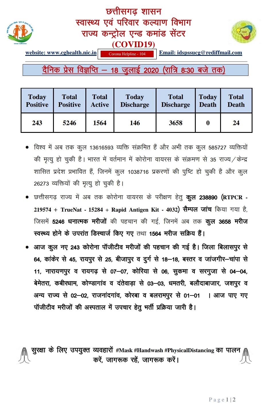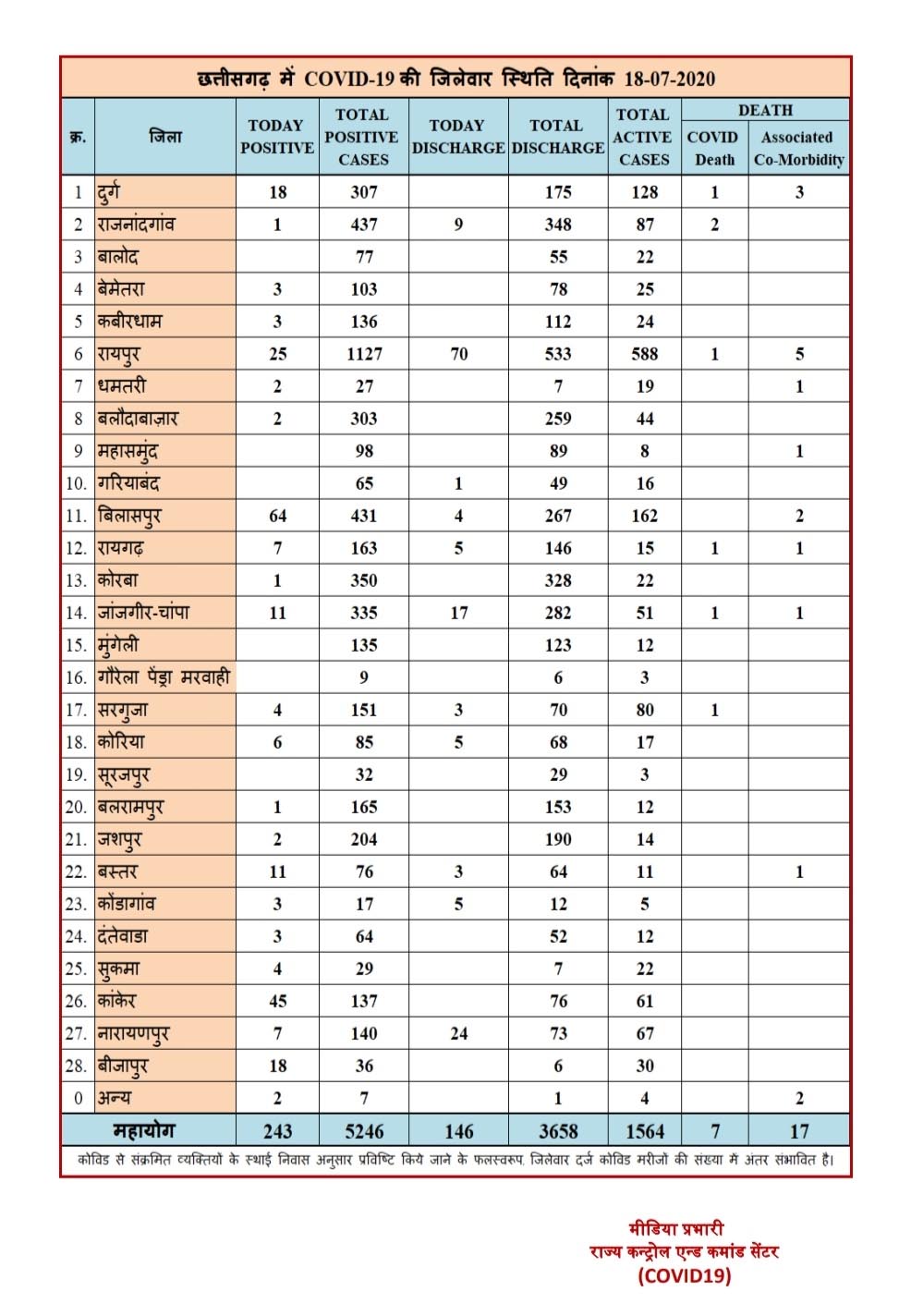 स्वास्थ्य विभाग द्वारा मिली जानकारी के अनुसार राज्य में आज कोरोना संक्रमित 243 नये मरीजों में क्रमश: बिलासपुर से 63, कांकेर 45, रायपुर 25, बीजापुर व दुर्ग से 18-18, बस्तर व जांजगीर-चांपा से 11-11, नारायणपुर व रायगढ़ से 07-07, कोरिया से 06, सुकमा व सरगुजा से 04-04, बेमेतरा, कबीरधाम, कोंडागांव व दंतेवाड़ा से 03-03, धमतरी, बलौदाबाजार, जशपुर व अन्य जगहों से 02-02 तथा राजनांदगांव, कोरबा व बलरामपुर से 01-01 मरीज मिले है। वहीं आज 146 मरीजों को डिस्चार्ज भी किया गया है जो क्रमश: रायपुर से 70, नारायणपुर 24, जांजगीर-चांपा 17, राजनांदगांव 09, कोरिया व रायगढ़ से 05, बिलासपुर 04, सरगुजा 03 व गरियाबंद 01 से शामिल है। इस प्रकार राज्य में अब तक कुल 5246 संक्रमितों में से 3658 मरीज स्वस्थ होकर डिस्चार्ज हो चुके है, जबकि 24 लोगों की मौत हुई है। वर्तमान में 1564 मरीज एक्टिव है।