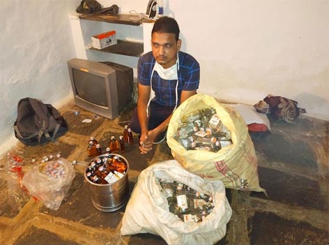 पुलिस ने आरोपी सुपरवाइजर के घर की तलाशी ली तो पुलिस को एक काले रंग के बैग में 35 पौव्वा गोल्डन डिलक्स विस्की की 180 एमएल की बोतल मिली। वहीं के प्लास्टिक की बोरी 350 नग खाली शीशी गोल्डन गोवा, एक पालीथिन में 80 नग गोल्डन गोवा विस्की की शीशियों का ढक्कन मिला। आरोपी ने शराब में मिलावट करना स्वीकर किया है। यह कार्रवाई थाना प्रभारी शेर सिंग बंदे सहित थाना कोतवाली और सायबर सेल की टीम ने की।बता दें कि कुछ माह पूर्व ही इसी एकता चौक अंग्रेजी शराब दुकान में आधी रात पुलिस ने छापा मार कर कुछ लोगों को गिरफ्तार किया था। ये लोग अवैध रूप से शराब की नकली बोतल, नकली ढक्कन में शराब की मिलावट करते पाए गए थे। इसके अलावा इसी दुकान से लगभग 10 करोड़ रुपए के घोटाले की बात सामने आई है जिसकी जांच चल रही है।