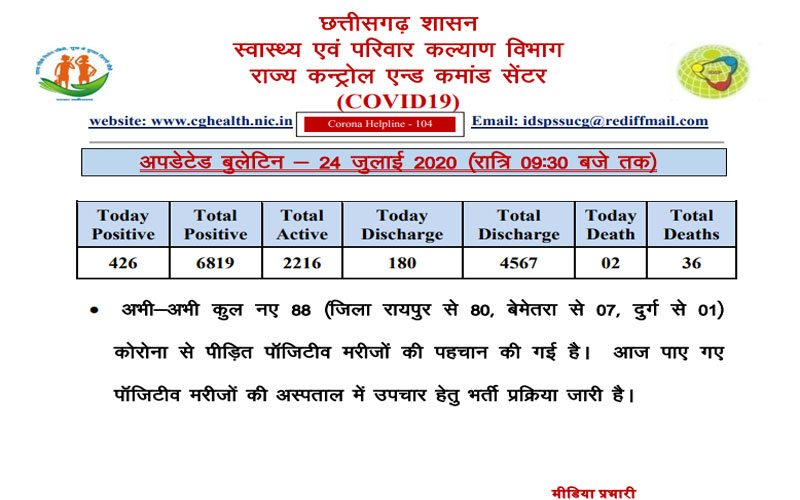 रायपुर। अभी-अभी 88 नए कोरोना मरीजों की पहचान हुई है। स्वास्थ्य विभाग ने अपडेटेड मेडिकल बुलेटिन जारी कर बताया कि रायपुर में 80 नए मरीजों की पहचान हुई है। इसी तरह बेमेतरा से 7 व दुर्ग से 1 कोरोना मरीज की पहचान हुई है। इससे पहले देर शाम जारी बुलेटिन में 338 मरीजों की पहचान होने की जानकारी दी गई थी। इनमें रायपुर में 164,राजनांदगांव से 28, दुर्ग से 19, बस्तर से 18, कांकेर से 15, कोंडागांव और कोरबा से 14-14, बलरामपुर से 11, रायगढ़ से 10, बीजापुर और सरगुजा से 9-9, सूरजपुर से 8, जांजगीर चांपा से 6, जशपुर से 3, बालोद बलौदाबाजार बिलासपुर और दंतेवाड़ा से 2-2,महासमुंद और गरियाबंद से 1-1 मरीज मिले थे। इस तरह से शुक्रवार को अब तक कुल 426 कोरोना मरीज की पहचान हुई है। आज रायपुर से कुल 244 मरीजों की पहचान हुई है। 180 लोगों को स्वस्थ होने पर आज डिस्चार्ज किया गया है। 2 लोगों की मौत हुई है। प्रदेश में अब तक 6819 कोरोना पॉजिटिव मरीज मिल चुके है। इनमें 4567 मरीजों को स्वस्थ होने पर डिस्चार्ज किया जा चुका है। राज्य में अब तक 36 मौत की पुष्टि की गई है। एक्टिव मरीजों की संख्या 2216 पहुंच चुकी है।
