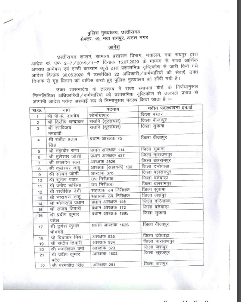 रायपुर। डीजीपी डीएम अवस्थी ने 22 पुलिसकर्मियों का तबादला आदेश जारी किया है। इसके साथ ही सभी को निर्देश दिया गया है कि कोरोना से उत्पन्न वर्तमान स्थिति को देखते हुए जल्द से जल्द आमद देने कहा गया है। जारी आदेश में स्टेनोग्राफर, सहायक उप निरीक्षक, प्रधान आरक्षक, उप निरीक्षक सहित आरक्षकों का तबादला किया गया है।