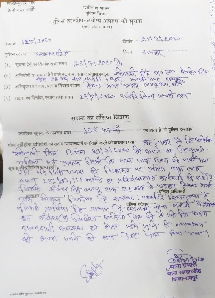 पुलिस ने धारा 155 के तहत मामला संज्ञान में लिया है जिसका आशय है कि शिकायत पर अभी FIR दर्ज नही की गई है तथा प्रार्थी के समक्ष मामले को सीधे न्यायालय में प्रस्तुत करने की स्थिति है।