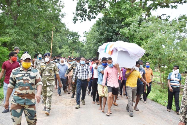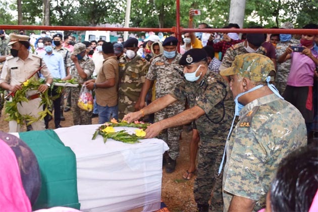 बीजापुर:- सोमवार को प्रातः जिला नारायणपुर क्षेत्रान्तर्गत कररेमेटा छसबल कैम्प में अचानक हुये नक्सली हमले में कैम्प मोर्चा में तैनात छसबल 22/ए समवाय का जवान जितेन्द्र बाकड़े को सिर में गोली लगने से शहीद हो गये । घटना में शहीद जवान बीजापुर क्षेत्रान्तर्गत ग्राम मांझीगुड़ा का स्थाई निवासी था । शहीद के पार्थिव शरीर हेलीकाप्टर के माध्यम से बीजापुर पहुचाया गया । शहीद आरक्षक/695 जितेन्द्र बाकड़े को गृह ग्राम मांझीगुड़ा में श्रद्धांजली एवं सलामी दी गई एवं पार्थिव शरीर को मुखाग्नि दी गई ।