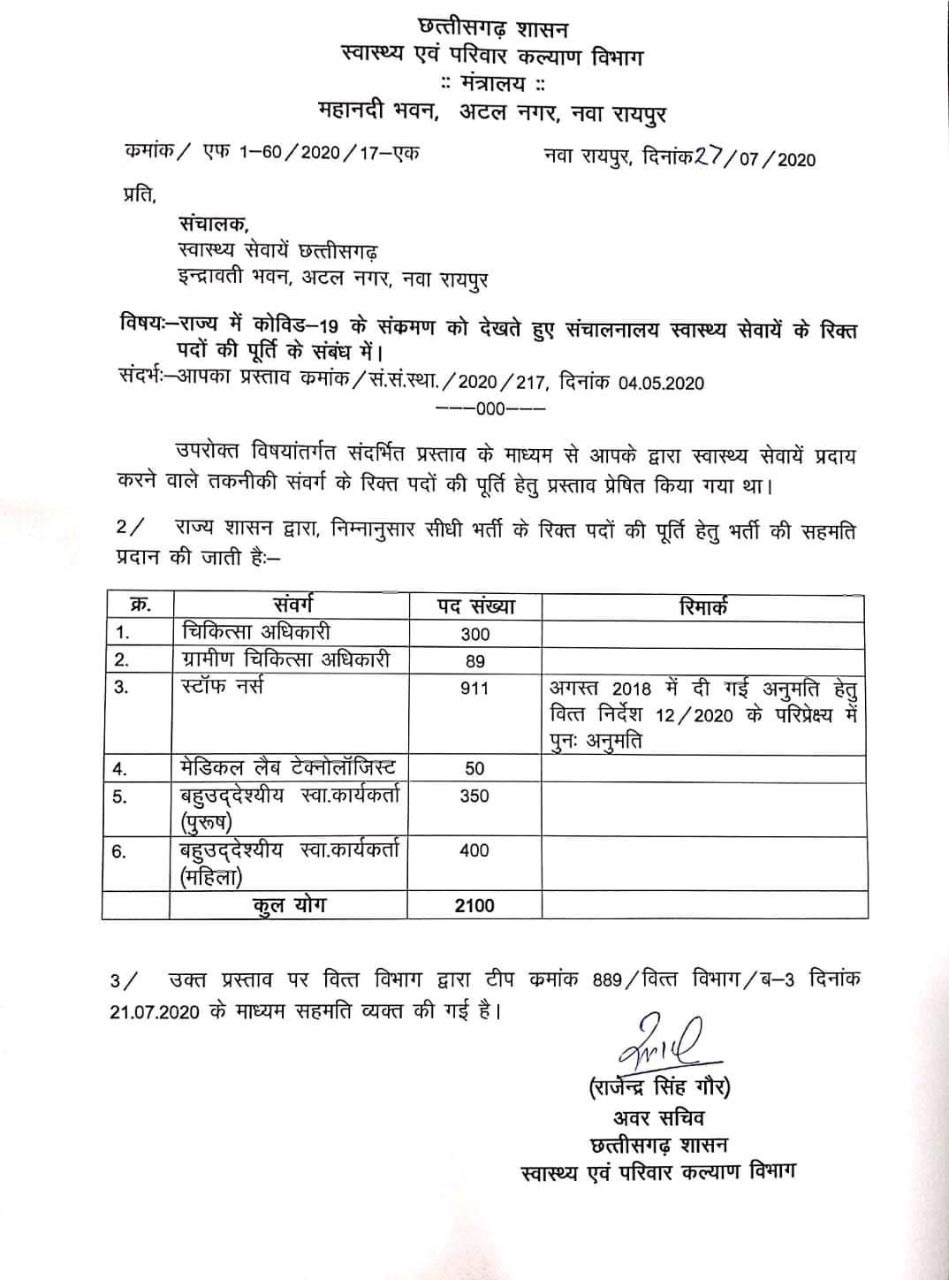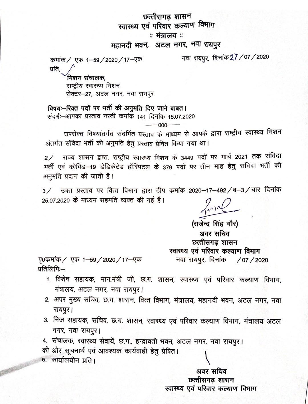 छत्तीसगढ़ में कोविद 19 के संक्रमण के साथ ही बीमारियों की दूसरी चुनोउतियो का मुकाबला करने बडे पैमाने में चिकित्सा अधिकारियों , ग्रामीण चिकित्सा अधिकारियों तथा स्वास्थ्य कार्यकर्ताओ की भर्ती की जाने वाली है। मंत्रालय से जारी पत्र के अनुसार इसके लिये आवश्यकतानुसार वित्त विभाग की अनुशंसा भी पूर्व में ली जा चुकी है।