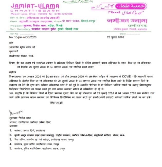 भिलाई। जमीअत उलेमा हिंद छत्तीसगढ़ ने राज्य सरकार से ईद उल अजहा और रक्षाबंधन त्यौहार के मद्देनजर 29 जुलाई से 4 अगस्त तक लॉक डाउन स्थगित रखने की मांग की है। जमीअत के अध्यक्ष मुहम्मद फिरोज खान ने इस संबंध में मुख्यमंत्री भूपेश बघेल को पत्र भेजा है। जिसमें उन्होंने मुख्यमंत्री से मांग की है कि एक अगस्त को ईद-उल-अजहा और 3 अगस्त को रक्षा बंधन त्यौहार के तारतम्य में कोविड-19 महामारी बचाव अभियान के अंतर्गत किए जा रहे लॉक डाउन को 29 जुलाई से 4 अगस्त तक स्थगित किए जाने के निर्देश समस्त जिला कलेक्टरों हेतु जारी किए जाए। विभिन्न जिलों में जिला प्रशासन द्वारा किए जा रहे लॉक डाउन को 29 जुलाई से 4 अगस्त तक स्थगित रखा जाए जिससे आमजन मास्क लगाकर एवं फिजिकल डिस्टेंसिंग का पालन करते हुए अपनी-अपनी त्यौहारी प्रार्थनाएं धार्मिक स्थलों पर कर सकें। इस पत्र की प्रतिलिपि गृहमंत्री मुख्य सचिव, पुलिस महानिदेशक और छत्तीसगढ़ के समस्त कलेक्टरों को भी भेजी गई है।