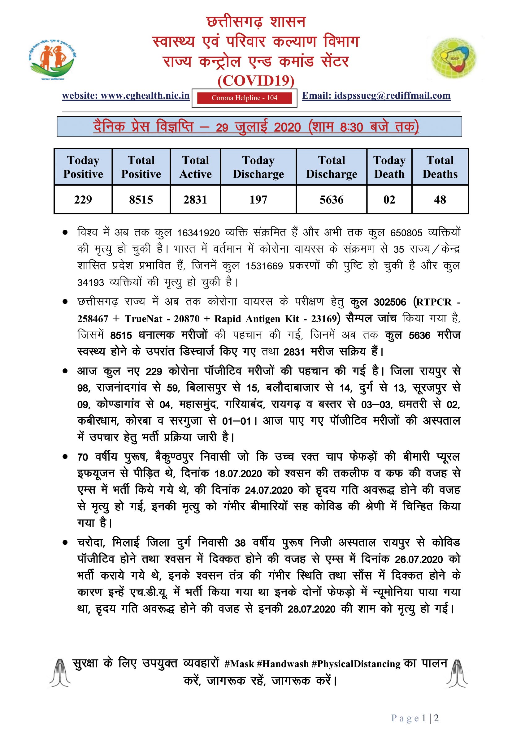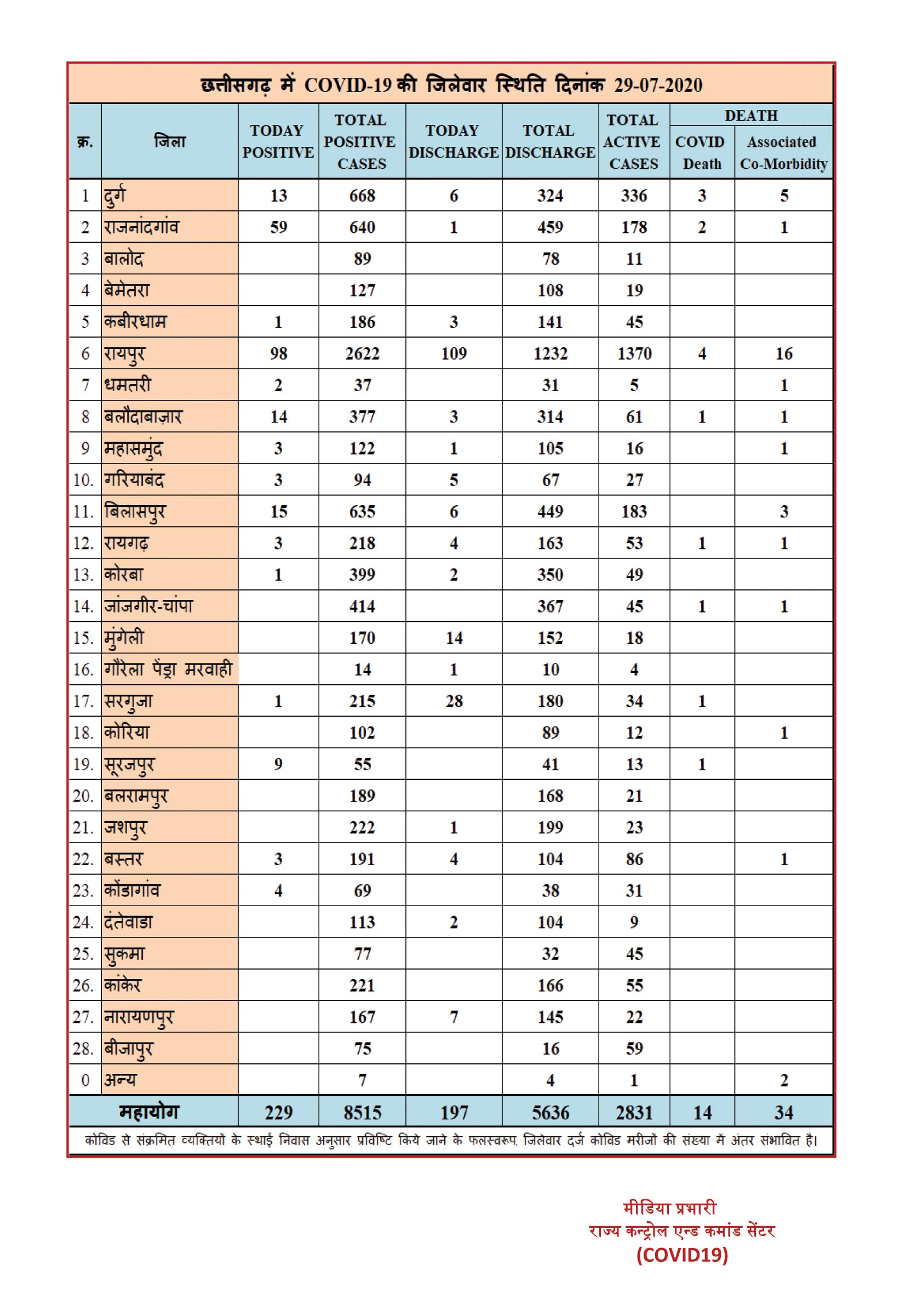 रायपुर। प्रदेश में कोरोना संक्रमितों का आंकड़ा रोजाना बढ़ता जा रहा है। बुधवार को प्रदेश भर में 229 मरीज मिले हैं। इसके बाद एक्टिव मरीजों की संख्या 2831 तक पहुंच गई है। स्वास्थ्य विभाग ने दो मौत की पुष्टि की है। इसमें 70 वर्षीय बुजुर्ग और एक 38 वर्षीय पुरुष की मौत हुई है। आज मिले 229 नए मरीजों में रायपुर से 98, राजनांदगांव से 59, बिलासपुर से 15, बलौदाबाजार से 14, दुर्ग से 13, सूरजपुर से 9, कोंडागांव से 4, महासमुंद, गरियाबंद, रायगढ़ और बस्तर से 3-3, धमतरी से 2, कबीरधाम, कोरबा और सरगुजा से 1-1 मरीज मिले हैं।