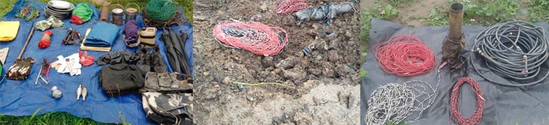 देशी राकेट लांचर, 02 टिफिन बम, दो पाइप बम बड़ी मात्रा में वायर-केबल नक्सली वर्दी बरामद