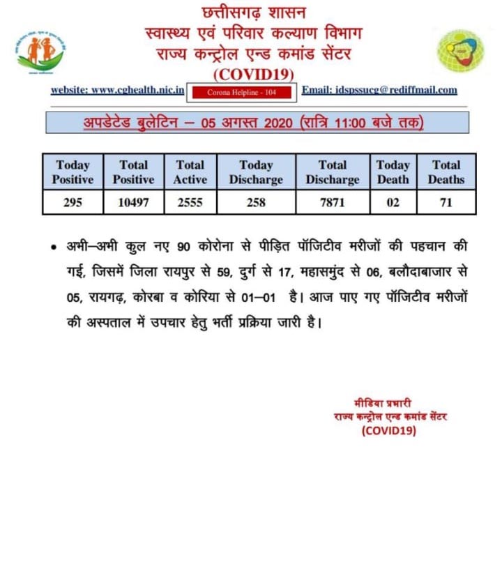 रायपुर। छत्तीसगढ़ में बुधवार को 295 कोरोना पॉज़िटिव केस सामने आए हैं। यह आंकड़ा देर रात 90 नए मरीजों की पहचान के बाद पहुंचा। स्वास्थ्य विभाग ने रात 11 बजे की स्थिति में अपडेटेड मेडिकल बुलेटिन जारी कर जानकारी दी। इसके मुताबिक नए 90 मरीजों में रायपुर जिले के 59, दुर्ग के 17,महासमुंद के 6,बलौदाबाजार के 5,रायगढ़,कोरबा व कोरिया के 1-1 मरीज शामिल हैं। इसी तरह देर शाम जारी मेडिकल बुलेटिन में 205 पॉजिटिव केस की पहचान होने की जानकारी दी गई थी। इनमें रायपुर से 83, दुर्ग से 32, बस्तर से 18, राजनांदगांव से 16, महासमुंद से 13, रायगढ़ और बलौदाबाजार से 9-9, जशपुर से 5, सरगुजा और नारायणपुर से 4-4, जांजगीर चांपा, कांकेर और अन्य राज्य से 2-2, बेमेतरा, कबीरधाम, गरियाबंद, बिलासपुर, सूरजपुर और कोंडागांव से 1-1 मरीज मिले थे। 258 मरीजों को स्वस्थ होने पर डिस्चार्ज किया गया।
